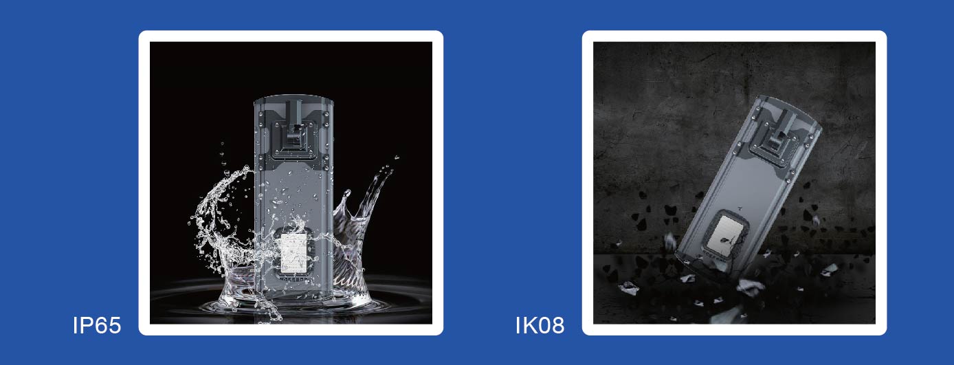 IP65 : ป้องกันฝุ่นละอองสิ่งแปลกปลอมได้อย่างสมบูรณ์ รวมถึงป้องกันละอองน้ำ และความเสียหายที่อาจจะเกิดขึ้นต่อโคมไฟได้ | IK08 : แรงกระแทก 10J (เทียบเท่ากับแรงกระแทกของวัตถุน้ำหนัก 5 กิโลกรัมที่ตกลงมาจากความสูง 220 มม. ลงมาสู่พื้น) |