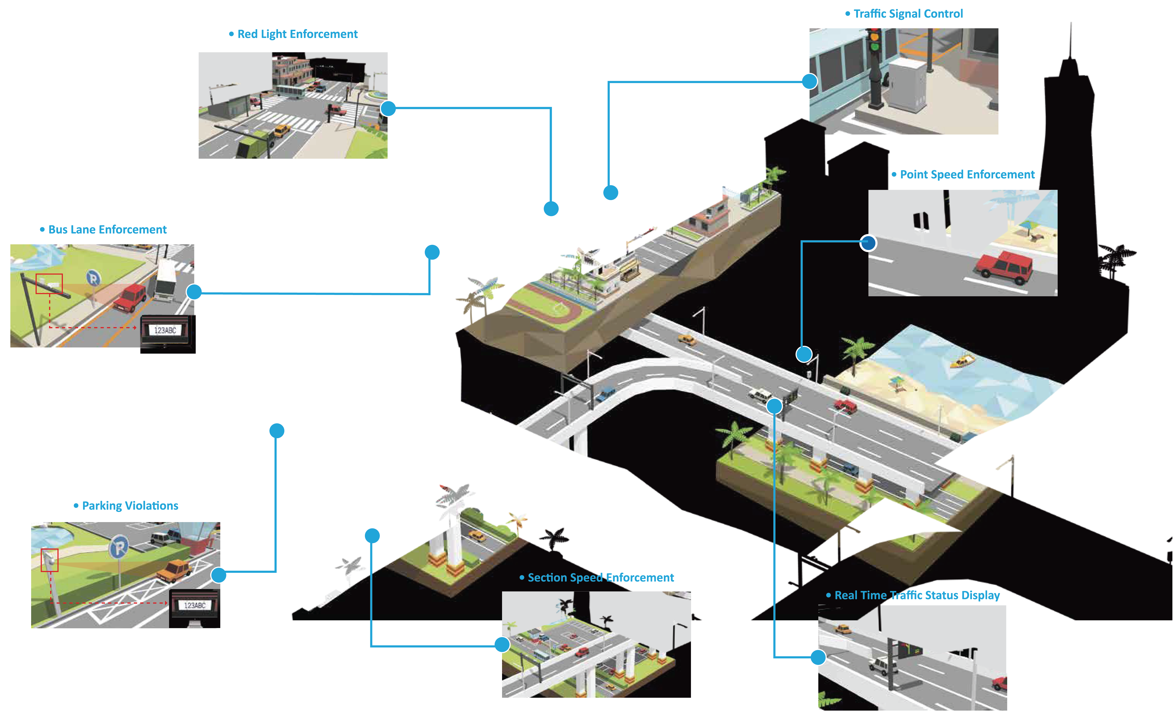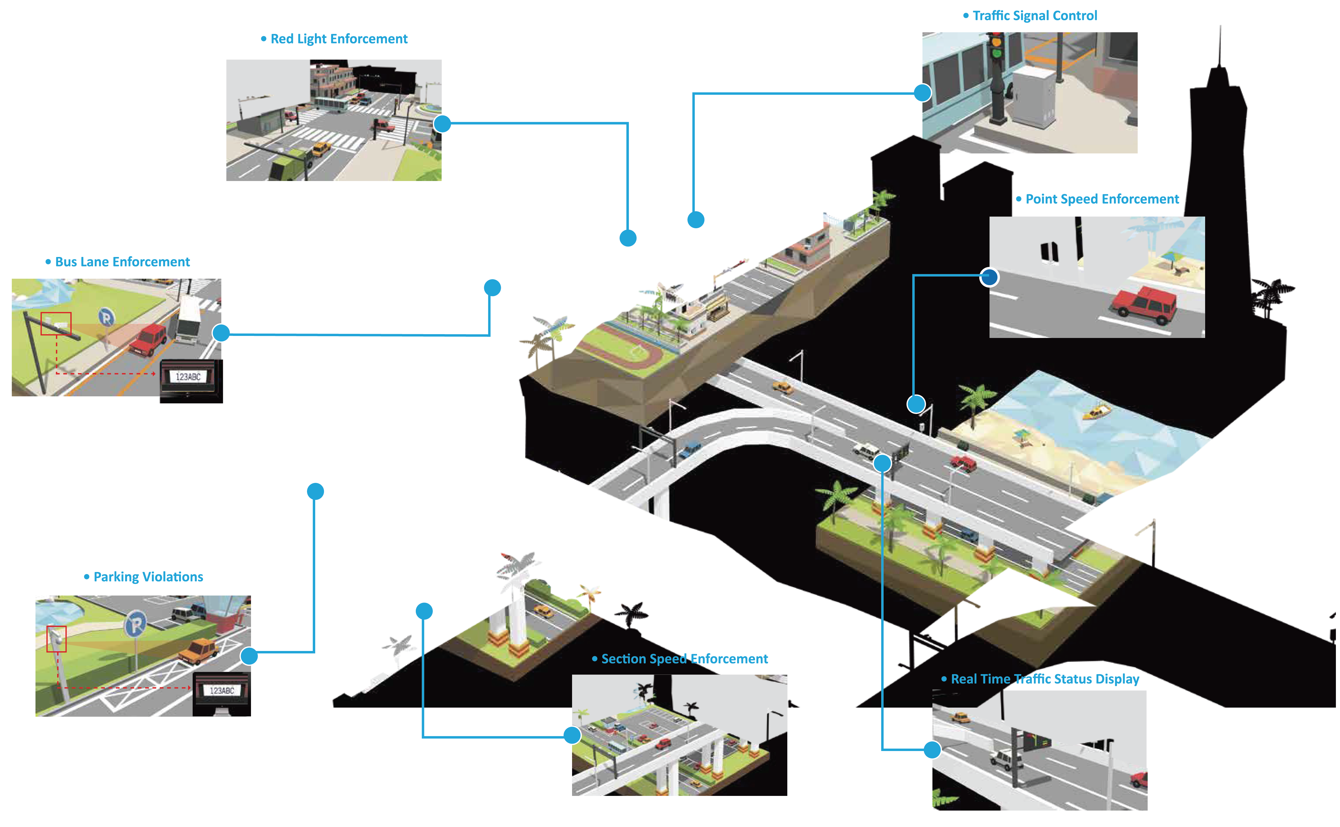 | การบังคับใช้กฎหมายฝ่าไฟแดง (Red Light Enforcement) | การตรวจจับความเร็วเกินกำหนด (Speeding Detection) | การบังคับใช้กฎหมายช่องทางรถโดยสาร (Bus Lane Enforcement) |
