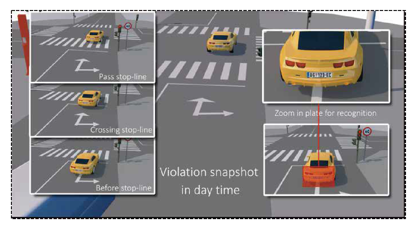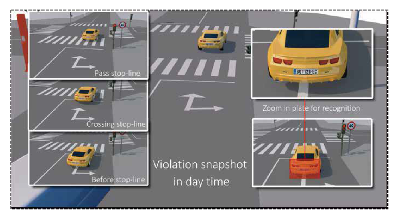 จับภาพเหตุการณละเมิดจำนวน 4 ภาพ ระหว่างการกระทำผิด เพื่อใช้เป็นหลักฐานรวมถึงภาพที่แสดง สถานะของสัญญาณไฟจราจร และ หมายเลขป้ายทะเบียน